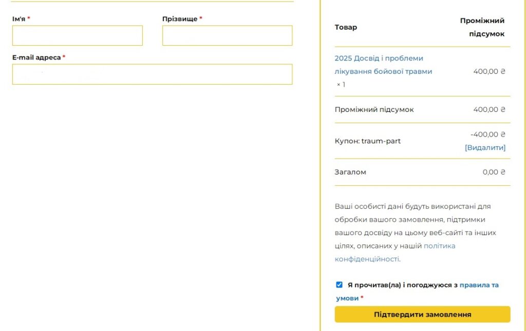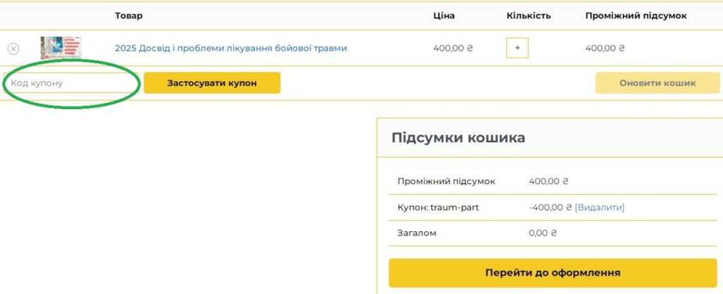 У поле “Код купону” ввести промокод (надісланий особисто вам) та натиснути кнопку “Застосувати купон”.