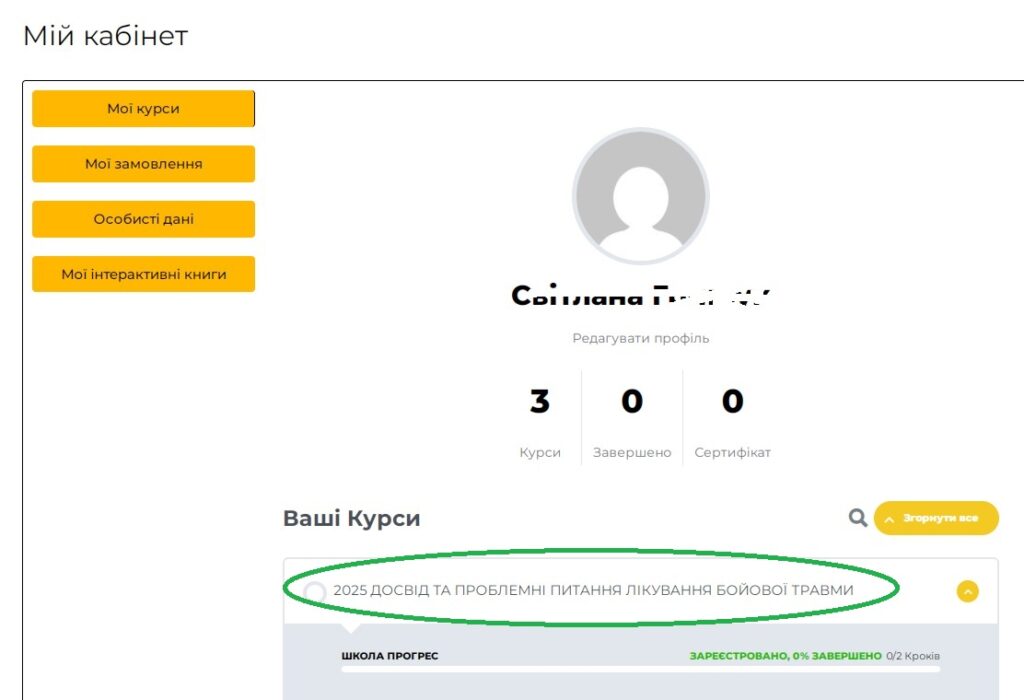 В особистому кабінеті натискаєте кнопку “Мої курси” та обираєте назву конференції.