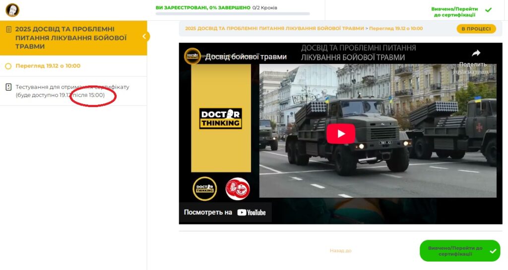 19 грудня, починаючи з кінця трансляції і до кінця доби через особистий кабінет на платформі doctorthinking.org пройти тестування та отримати сертифікат